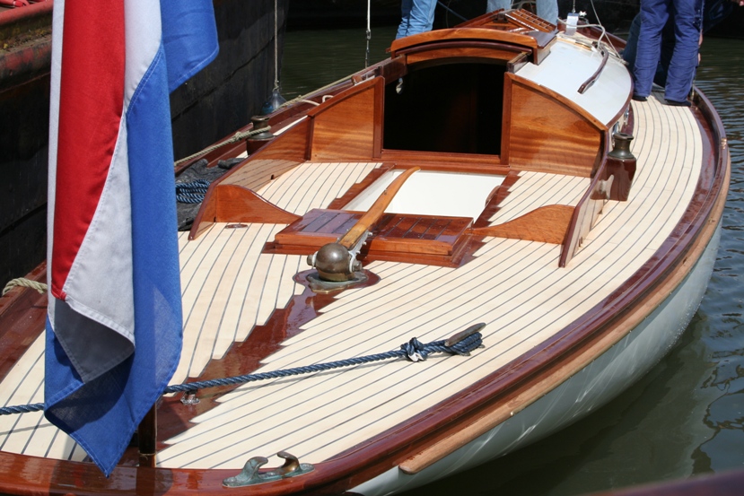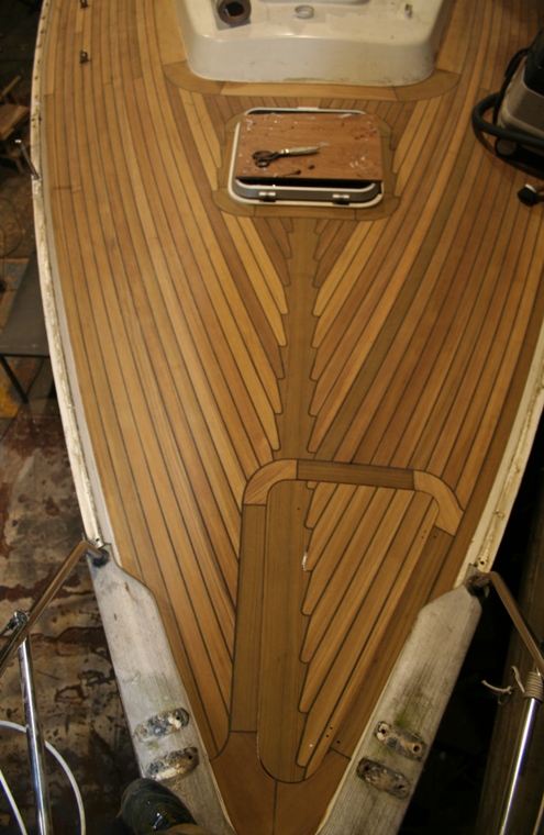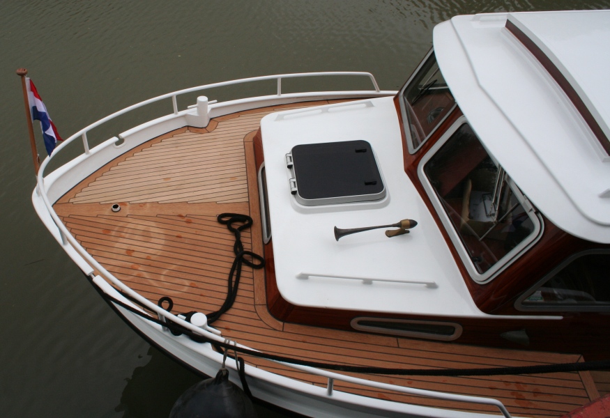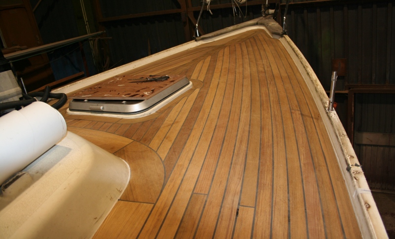 Testdek op motorjacht de Tijgerhaai van de Waterkampioen: aan de bakboordzijde van het voordek Afzelia Doussie en aan stuurboord Modipine FSC.