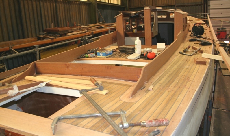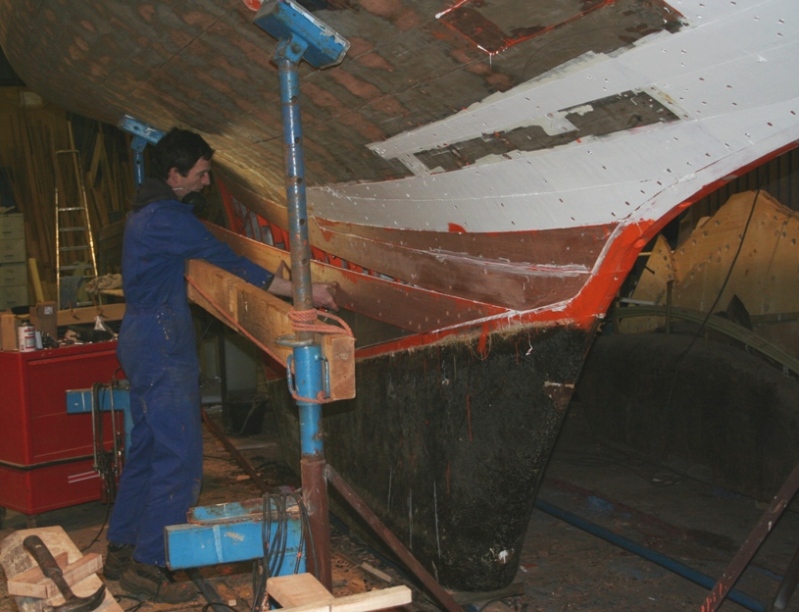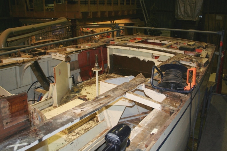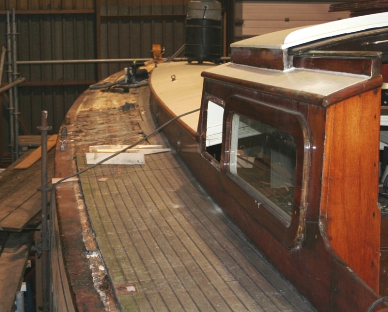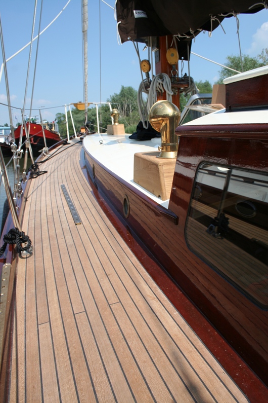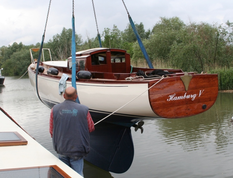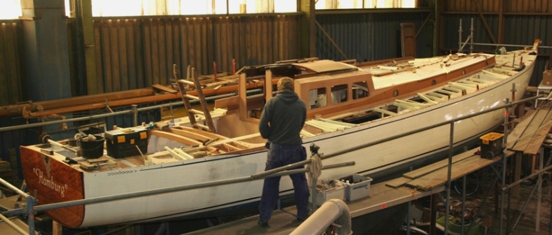 uitgevoerd. In het eerste winterseizoen is de romp grondig onderhanden genomen. Nieuwe wrangen en spanten, zowel rvs als hout. De stevenbalk is geheel vervangen tot de boeg. De verbindingsknie tussen kielbalk en stevenbalk is vervangen, evenals een flink aantal gangen uit het onderwaterschip. Gangen die niet vervangen zijn, zijn veelal wel aangeheeld dmv het inlijmen van splines. Een nieuw rvs mastspoor is geplaatst en de kielbouten zijn vervangen. Daarna heeft de Hamburg een zomer rustig kunnen varen, en was in het volgende winterseizoen de opbouw en het dek aan de beurt. De gehele dekconstructie is vervangen, en de opbouw is gerestaureerd en teruggebracht naar het oorspronkelijke ontwerp. Het geheel is afgemaakt met een massief teak dek. Deze winter zal een en ander in het interieur aangepast worden.